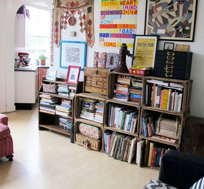 Если размеры гостиной скромны, и паллетам там не место, для журнального столика оно найдется. И не простого, а из ящиков. Четыре ящика, поставленные на ребро, это не только дизайнерский стол, но и вместительная система хранения.